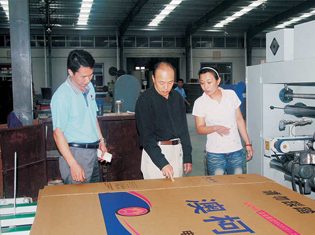 ISO9001管理体系认证审核组长刘鹏程(左二)在山东睿丰包装有限公司印刷车间指导工作。公司顺利通过了ISO9001:2000质量体系认证,并通过了ISo14000国际环境质量体系认证。